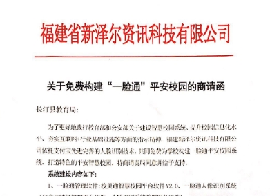 近日,新泽尔科技与长汀教育局就平安校园的建设达成合作协议,新泽尔将联合支付宝为长汀一中、长汀汀州小学等十多所中小学免费构建“一脸通”平安校园。